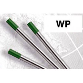 - WP — Вольфрамовый электрод с содержанием вольфрама не менее 99,5 %. Электроды обеспечивают хорошую устойчивость дуги при сварке на переменном токе, сбалансированном или не сбалансированном с непрерывной высокочастотной стабилизацией (с осциллятором). Эти вольфрамовые электроды предпочтительны для сварки на переменном синусоидальном токе алюминия, магния и их сплавов, так как они обеспечивают хорошую устойчивость дуги как в аргоновой, так и в гелиевой среде. Из-за ограниченной тепловой нагрузки рабочий конец электрода из чистого вольфрама формируют в виде шарика.