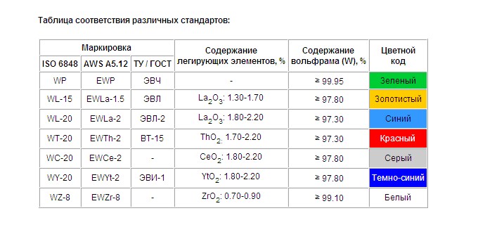Для улучшения качества электрода (например, устойчивости к высоким температурам, повышения стабильности горения дуги) в чистый вольфрам вводят в качестве добавки окислы редкоземельных металлов. Существует ряд разновидностей вольфрамовых электродов, в зависимости от содержания этих добавок. Этим определяется марка электрода. Марку электрода в наше время легко запомнить по цвету, в который окрашен один конец. Вольфрамовые электроды делятся на три типа: Постоянного (WT,WY), Переменного (WP, WZ) и Универсальные (WL,WC).